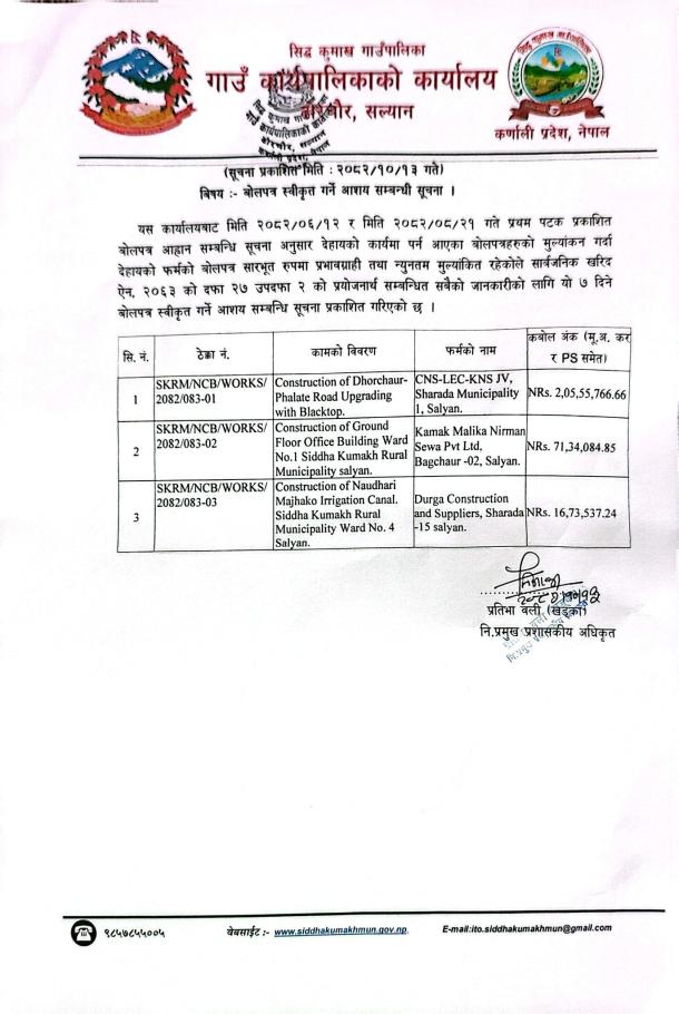 बोलपत्र स्वीकृत गर्ने आशय सम्बन्धि सूचना