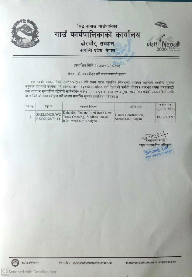बोलपत्र स्वीकृत गर्नेे आशय सम्बन्धि सूचना
